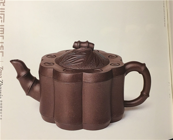 第六件,《亮節(jié)壺》以竹為主題,壺身由八節(jié)竹子圍起,竹節(jié)形的壺鈕、壺把、壺嘴相互呼應(yīng),壺蓋飾有竹牙竹葉,營造了秀美典雅,清朗高潔的風(fēng)骨與氣質(zhì)。