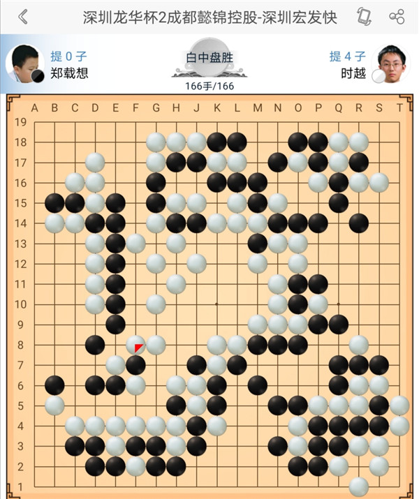 一臺快棋時越執(zhí)白對陣鄭載想。開局黑棋打入左邊白棋模樣,之后黑棋棋形處理不佳,被白棋一路猛攻后損失慘重。之后白棋沒有再給黑棋機會活動勝利。