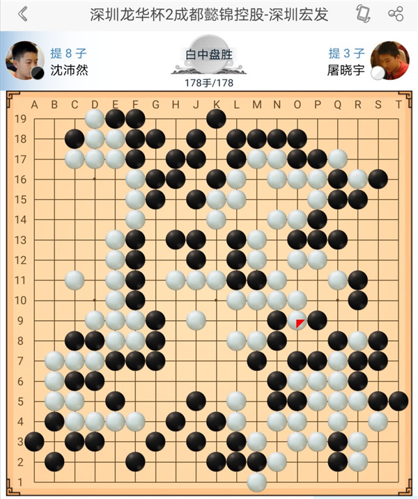 第四臺小將沈沛然執(zhí)黑對陣屠曉宇,行至178手時,盤面形勢白微弱領(lǐng)先。大家認為若努力收官或許有一線希望時,沈沛然停鐘認輸,也許是看清了形勢的無奈之舉吧。