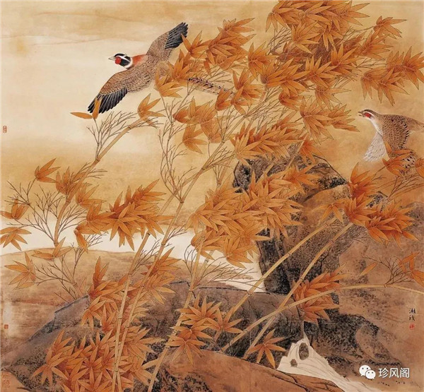 在構(gòu)圖上,他往往打破傳統(tǒng)工筆花鳥畫中的一些常見程式,講究“起承轉(zhuǎn)合”“賓主揖讓”與“呼應(yīng)關(guān)系”,強調(diào)構(gòu)圖布勢的“自然天成”;在勾勒上,注重墨分五色,焦、濃、重、淡、清,用筆的墨色根據(jù)不同對象、不同結(jié)構(gòu)而進行變化,筆法的起落、轉(zhuǎn)折、頓挫都與表現(xiàn)的形象、性質(zhì)有極密切的關(guān)系;在用色上,他一改當(dāng)代一部分花鳥畫流于程式、設(shè)色濃艷匠氣的弊端,而是集合多種畫法,在傳統(tǒng)固有色中融入西洋畫法的色彩規(guī)律,追求整體色調(diào)的對比與協(xié)調(diào),所以其作品體現(xiàn)出不同于傳統(tǒng)工筆花鳥畫的意境和氛圍。
