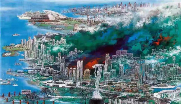 宋玉明從金陵畫派的新傳統(tǒng)跨越到城市表現(xiàn)的積彩拓墨畫法,既體現(xiàn)了現(xiàn)代化城市對于變革傳統(tǒng)的時代訴求,也體現(xiàn)了他移居深圳后這座新興城市文化對于他的深刻影響。畢竟,連續(xù)數(shù)屆的深圳水墨雙年展對于水墨在跨文化中重要作用與表現(xiàn)方法的突破,都給予他至深的思想開拓。這表明,城市山水畫已不單純是用中國畫表現(xiàn)城市的命題,而是其中能夠蘊含多少城市文化觀念與城市審美的方法,宋玉明對于城市山水畫的探索,體現(xiàn)的正是這樣一種對城市現(xiàn)代文化的思想融合性。而不拘謹(jǐn)于城市一磚一石、一街一道、一房一樓的描繪,著眼于發(fā)揮水墨與彩墨表現(xiàn)的自由性,抑或體現(xiàn)了人性、自然與現(xiàn)代城市共同作用的現(xiàn)代生活方式與人文理想。的確,純粹用中國畫或水墨畫來探索城市的現(xiàn)代化景觀表現(xiàn),也許只是淺層次的審美需求;而只有當(dāng)把山水畫作為人與自然和諧統(tǒng)一的觀念表達(dá)植入城市現(xiàn)代化的審美訴求時,城市山水畫才能真正凸顯出其深刻的美學(xué)價值。這正是我們從宋玉明的作品里能夠讀解到的他對于城市山水畫審美理想的一種勾畫。