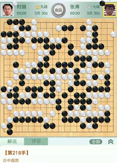 時越快棋執(zhí)白對陣張濤。右邊作戰(zhàn)時候,黑棋沒有選擇造劫劫爭而是退讓,被白將右邊幾子吃掉后又吃掉右上黑棋,黑棋局面落后。之后黑棋右下又死活看錯被白先手活出,導致雪上加霜,實際上棋局已經(jīng)結(jié)束。
