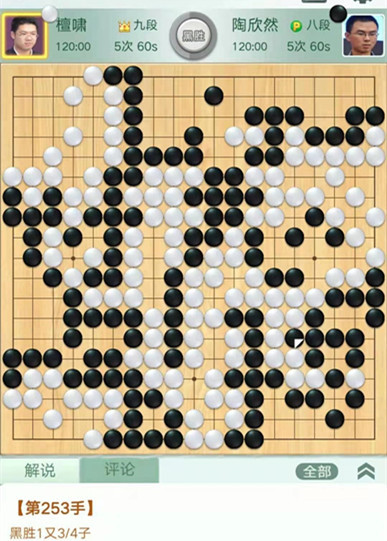 陶欣然執(zhí)黑對陣檀嘯。中盤白棋在右邊下出緩手,導致攻守逆轉(zhuǎn),白棋被迫做劫求活。黑棋利用劫爭中央連走兩手獲利巨大。之后黑棋穩(wěn)健收官將優(yōu)勢保持至終局。