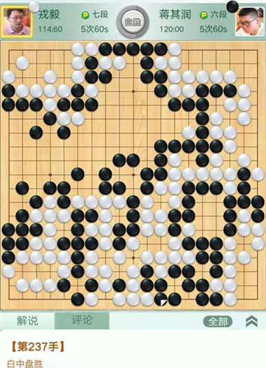 戎毅執(zhí)白對陣蔣其潤。開局白取地中央黑模樣巨大,白淺消后黑棋攻擊不當,被白活出兩塊棋后白棋領(lǐng)先。之后黑棋左下棄子圍空又虧損,白棋以較大優(yōu)勢獲得勝利。