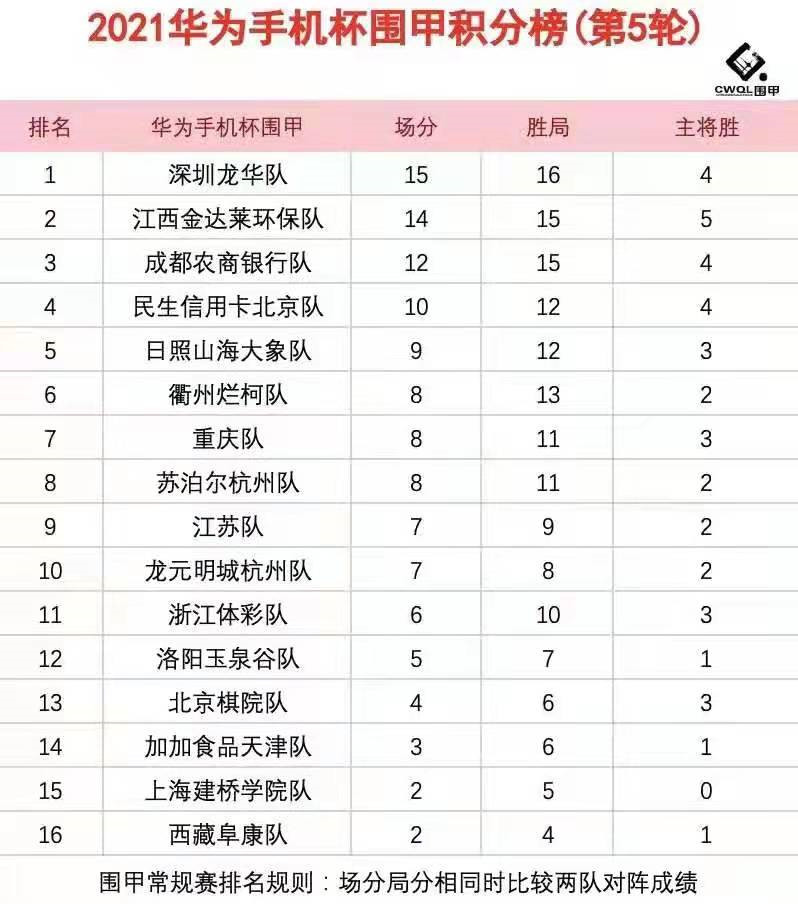 第五輪各隊戰(zhàn)況如下:衢州爛柯4比0勝加加食品天津;浙江體彩隊1:3深圳龍華隊;日照山海大象隊1:3江西金達萊環(huán)保隊;重慶隊3比1民生信用卡北京隊;成都農(nóng)商銀行隊3:1勝江蘇隊;西藏阜康2:2主將勝上海建橋?qū)W院;北京棋院隊2:2主將勝洛陽玉泉谷隊;蘇泊爾杭州2:2主將負龍元明城杭州。第一階段結(jié)束,深圳龍華隊五戰(zhàn)全勝積15分居“魁首”,江西金達萊環(huán)保隊僅以一分之差緊隨其后,成都農(nóng)商銀行隊積12分居第三位。