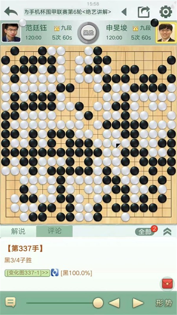 一臺申旻俊執(zhí)黑對陣世界冠軍范廷鈺。開局下邊白棋攻擊手法不當,黑處理好后局面領先。中盤黑棋在左邊計算精準,下出絕妙手段,在白棋空里出棋后優(yōu)勢擴大,之后黑棋穩(wěn)扎穩(wěn)打將優(yōu)勢保持至終局獲勝。