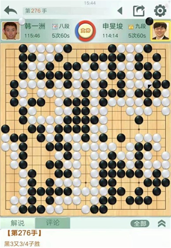 申旻俊主將執(zhí)黑對(duì)陣小將韓一洲,布局局面接近。進(jìn)入中后盤后,白方明顯功力不足,小失誤不斷。黑棋優(yōu)勢(shì)逐漸擴(kuò)大,最終以較大差距獲勝。