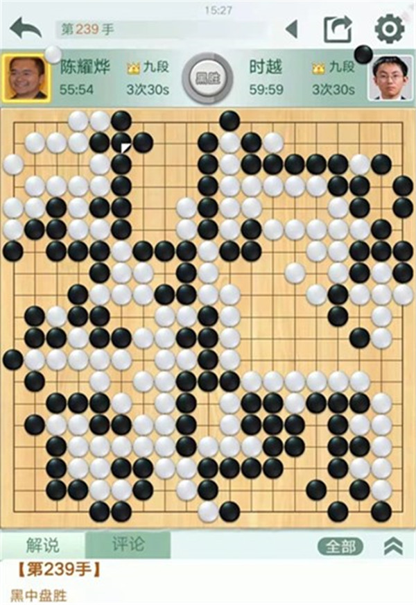 時(shí)越快棋執(zhí)黑對(duì)陣世界冠軍陳耀燁。中盤黑棋在右邊白勢(shì)中試應(yīng)手,白棋應(yīng)對(duì)松緩,被黑棋先手便宜十幾目棋,黑局面領(lǐng)先。之后黑棋行棋嚴(yán)謹(jǐn),中盤獲勝。
