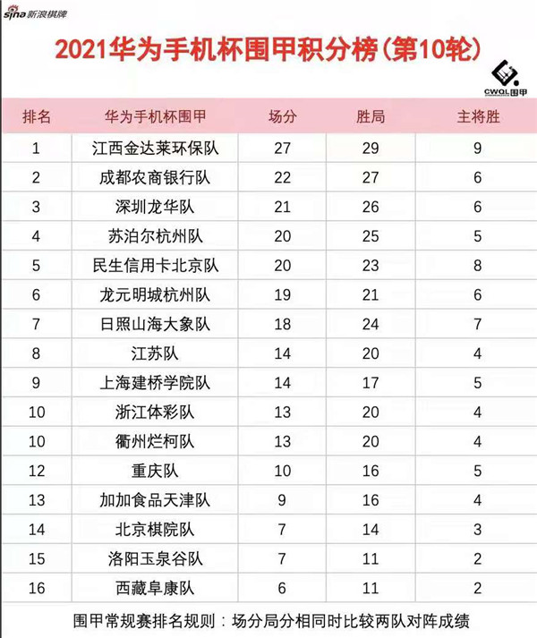 讀特客戶端?深圳新聞網(wǎng)2021年6月12日訊(記者周錦春)華為手機(jī)杯男子圍甲聯(lián)賽第二階最后一輪比賽今日塵埃落定,16圍甲隊(duì)伍可以暫時(shí)偃旗息鼓,安安心心地享受端午節(jié)的快樂時(shí)光了。第十輪深圳龍華隊(duì)對陣龍?jiān)鞒呛贾蓐?duì),以1:3再次敗退一步,從積分榜第二的位置降至第三,江西隊(duì)金達(dá)萊環(huán)保隊(duì)、成都農(nóng)商銀行隊(duì)分居狀元、榜眼之位。圍甲第三階段比賽預(yù)計(jì)在8月底繼續(xù)在浙江長興進(jìn)行。