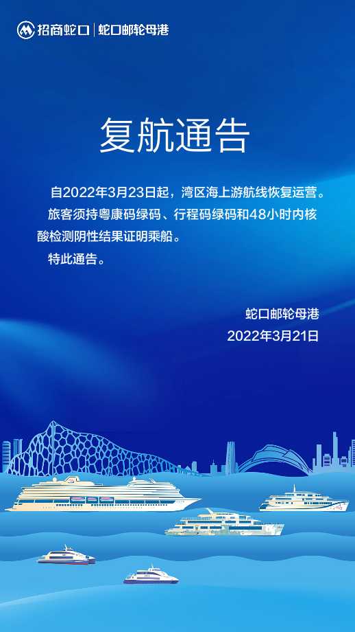 讀特客戶端 ·深圳新聞網(wǎng)2022年3月21日訊(記者 田志強(qiáng))記者從招商蛇口郵輪母港獲悉,自3月23日起,灣區(qū)海上游航線恢復(fù)運(yùn)營。搭乘該航線的旅客須持粵康碼綠碼、行程碼綠碼和48小時內(nèi)核酸檢測陰性結(jié)果證明乘船。