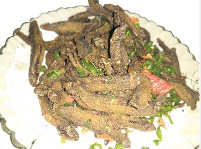 鳙魚經(jīng)過割肉后,剩下的骨頭魚肉可以煎燜或油炸,其味道更加鮮美可口。曾立輝說,煎燜鳙魚前,需將姜片與花生油放入油鍋加熱片刻,以避腥味,然后將斬成塊狀的鳙魚骨肉放入油鍋煎炸成金黃色即可。