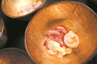 頭盤(pán) “荷塘魚(yú)趣”,主角黃花魚(yú)來(lái)自世界第三大江——長(zhǎng)江。步步生蓮是東方禪意,蓮子依依是情誼,蓮藕結(jié)結(jié)是路路通達(dá),Alvin Leung此次演繹的中式料理充滿(mǎn)東方元素,表達(dá)的是和諧交融。主菜“日式鮮味香烤和?!笔侨毡局鲝NHisamitsu Hataji 之作,他用創(chuàng)新手法融入經(jīng)典的日式料理中,表達(dá)一年四季食材與味道的關(guān)系,這是關(guān)于美食的光陰的故事。甜品出自Clement之手,是晚宴甜蜜的句號(hào)。