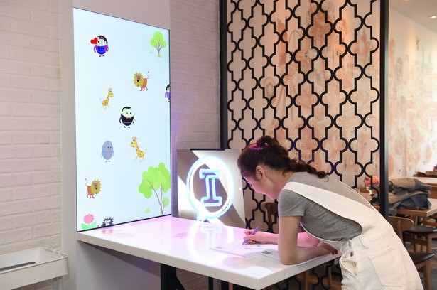 餐廳中心區(qū)域設置了一款風靡全球的“奇妙涂鴉”互動游戲,只需用蠟筆或微信小程序涂鴉,就能親眼見證自己填色的靜態(tài)畫像活靈活現地走入桌面走上墻壁,人人均可當一回“神筆馬良”,用創(chuàng)意打開無限想象,邊吃邊玩,將用餐變成一種愉悅的享受。