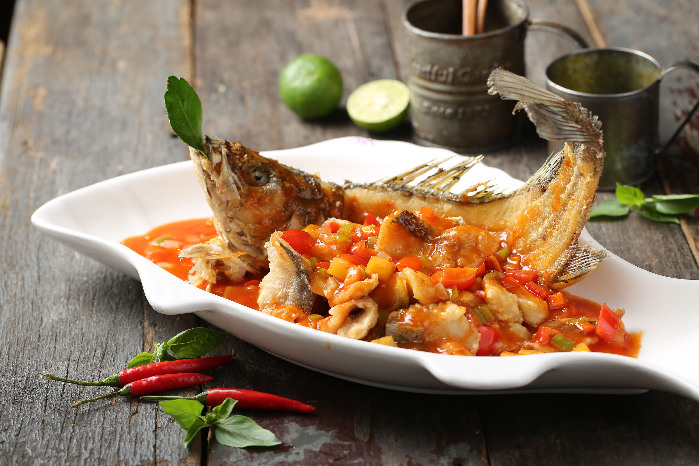 腌制過的鱸魚熱炸后澆上風(fēng)味獨(dú)特的三味醬汁,酸辣鮮香撲鼻而來,聞到都讓人口水直流!