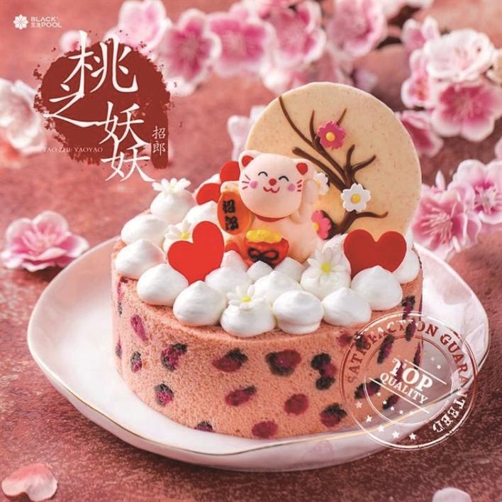 據(jù)黑池產(chǎn)品經(jīng)理介紹,“招郎蛋糕”是黑池最近重磅推出的新產(chǎn)品。蛋糕周圍覆盆子果干點(diǎn)綴而成的粉色豹紋,讓整個(gè)蛋糕充滿了野性魅惑又不失少女甜美。最為吸引眼球的,則是蛋糕表面,被桃花簇?fù)碇囊恢弧罢欣蛇鳌?。這只軟萌可愛(ài)的“招郎喵”,象征著,對(duì)得到這款蛋糕的人,最美好的祝愿,希望他們能夠遇到最好的愛(ài)情,找到心目中的那個(gè)他。