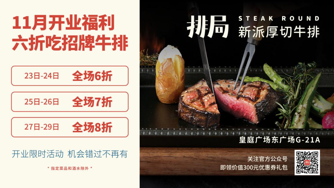 排局·新派厚切牛排為了慶賀開業(yè),也為消費(fèi)者們帶來(lái)了勁爆的開業(yè)福利——11月23日至24日兩天全場(chǎng)6折,11月25日至26日兩天全場(chǎng)7折,11月27日至29日三天全場(chǎng)8折。另外搜索“排局”關(guān)注官方公眾號(hào),即可免費(fèi)領(lǐng)取價(jià)值300元優(yōu)惠券禮包。