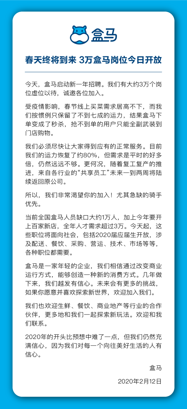 見圳客戶端·深圳新聞網(wǎng)2020年2月12日訊 2月12日,盒馬宣布開啟新一輪招聘,開放3萬個崗位,包括總部采購、技術(shù)、運(yùn)營等,也包括一線門店小二,其中配送小哥最為緊急。