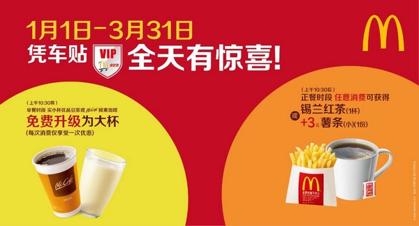 開(kāi)車取餐少接觸,麥當(dāng)勞“得來(lái)速”餐廳讓駕車的顧客購(gòu)餐更方便、安全且快速。駕車者不用下車,在餐廳車道的窗口即可完成點(diǎn)餐、付款和取餐?,F(xiàn)在免費(fèi)領(lǐng)取 VIP車貼享福利,3月31日前,早餐時(shí)段購(gòu)買小杯優(yōu)品豆?jié){或鮮煮咖啡可免費(fèi)升杯;正餐時(shí)段任意消費(fèi)即贈(zèng)錫蘭紅茶,或者加3元換一份小薯?xiàng)l。(常軍平)