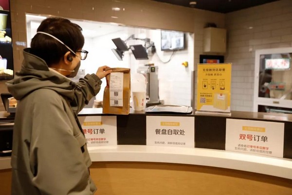 為了讓顧客放心,麥當(dāng)勞在安全服務(wù)的前提下,餐廳實(shí)施“無(wú)接觸配送”和“無(wú)接觸到店取餐”。所有外送訂單均附上“麥樂(lè)送放心卡”,標(biāo)注生產(chǎn)、配膳、外送人員姓名及體溫,做到餐品、人員可追蹤。顧客可選擇讓外送員將餐品送到指定位置取餐,在手機(jī)、餐廳自助點(diǎn)餐機(jī)或柜臺(tái)點(diǎn)餐后,無(wú)論堂食或外帶,員工都會(huì)將制作好的餐點(diǎn)裝入打包袋并封口,放置到取餐處。