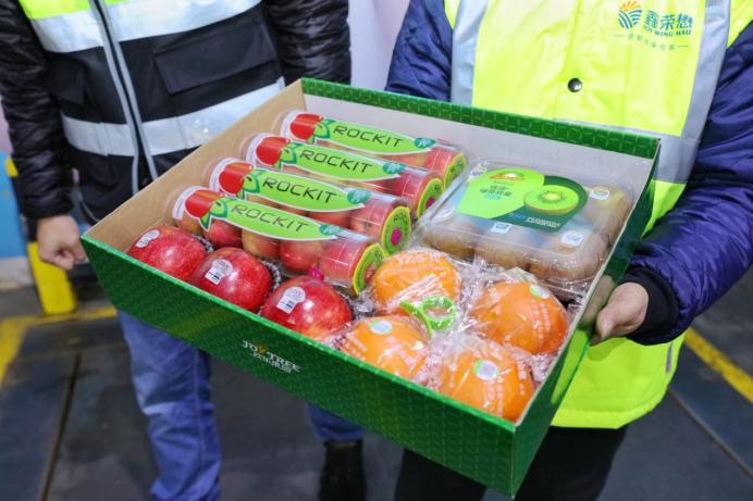 精美水果禮盒內(nèi)含愛妃蘋果、樂淇蘋果、佳沛奇異果和農(nóng)夫山泉17.5°橙。