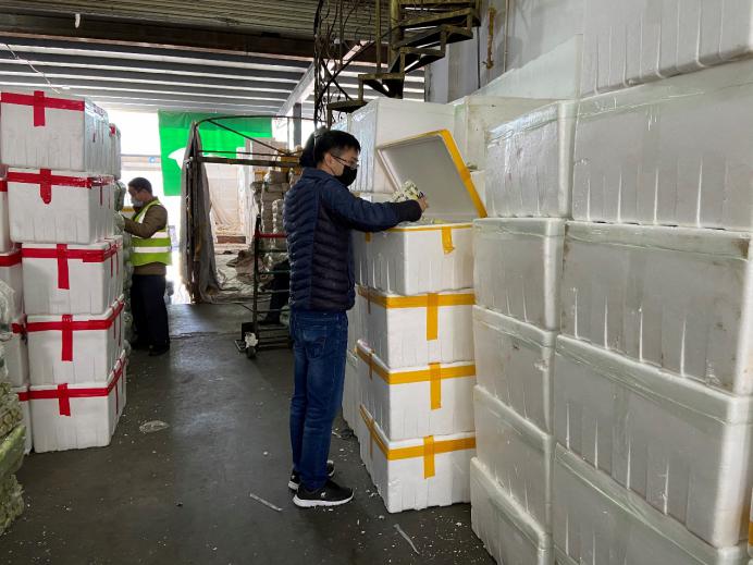 市場的檔主、物流車司機(jī)、加工工人,全部都帶上口罩,看新聞講跟人講話要保持距離,但忙起來真顧不了那么多,大家都在“搶貨”,這頭跟檔主商量好,那頭貨可能被拉走了。“貨要拉到自己的加工中心,才算是你的。”因?yàn)榇汗?jié)批發(fā)市場的檔口工人回去一大半了,沒人送貨,緊張的時候,有女同事干脆自己借一輛三輪車,把談好的貨源直接拉走。