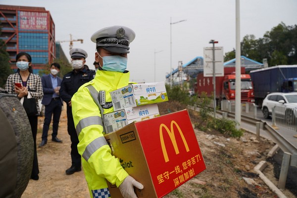 你們?cè)谝痪€(xiàn)戰(zhàn)疫,我們來(lái)為你補(bǔ)給!隨后,市關(guān)愛(ài)辦攜手伊利集團(tuán)、麥當(dāng)勞先后前往光明羌下公安檢查站、寶安區(qū)松安防疫檢查點(diǎn),為正在一線(xiàn)忙碌的工作人員,送上愛(ài)心牛奶與熱乎乎的愛(ài)心午餐?!澳銈冃量嗔恕薄ⅰ袄^續(xù)加油”……每發(fā)放一次牛奶與午餐,工作人員都不忘了戰(zhàn)疫者們致敬致謝。