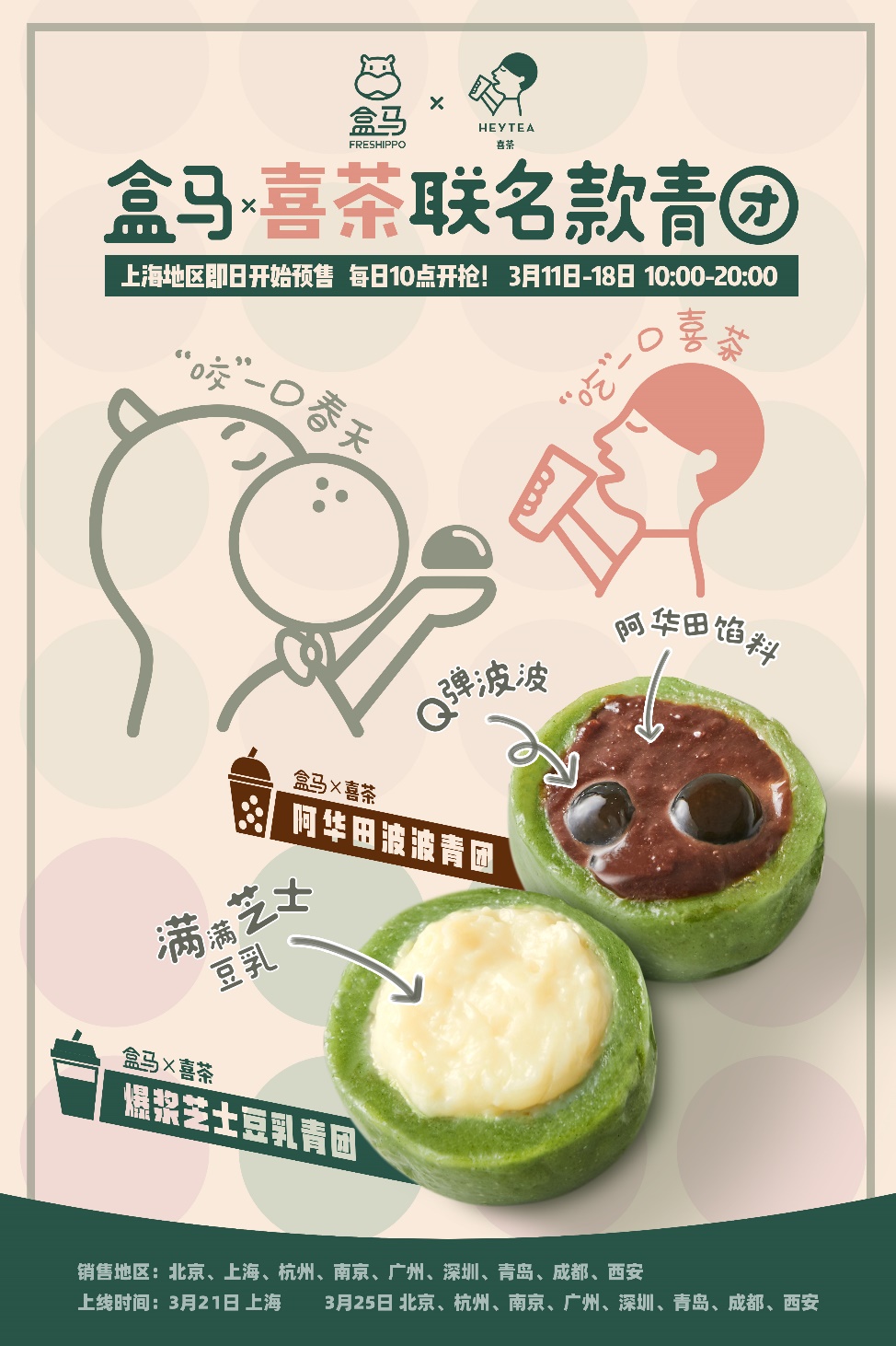 據(jù)了解,盒馬×喜茶聯(lián)名青團(tuán)于3月11日開(kāi)啟上海地區(qū)的預(yù)售,3月21日將正式上線。北京、杭州、南京、廣州、深圳、青島、成都、西安等地將于3月25日上線,屆時(shí)消費(fèi)者可通過(guò)盒馬線上下單,30分鐘就能吃上春天的味道。