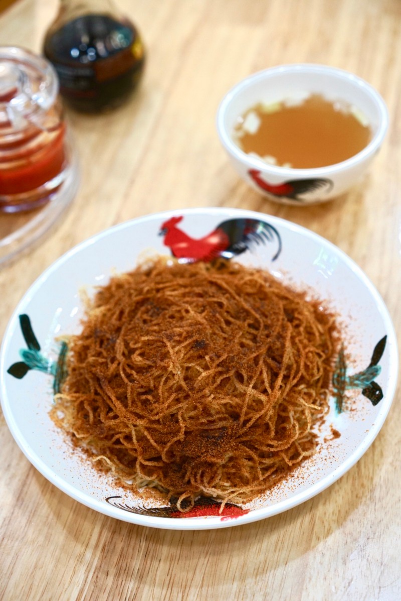 他家的云吞面同樣投注了許多的心機。湯底用厚身的油地、淡水蝦子、蝦米、金華火腿和豬骨來熬制,每天早上3點半開始煲,足足煲上3個小時。他認(rèn)為如今的雞蛋香味并不遜色于鴨蛋,因此在做面時,他用的是雞蛋,蛋清與蛋黃都用上。蛋清增加面的硬度,蛋黃帶來香度。面條同樣用高筋面,面所用的堿水,是有著上百年歷史的陳村食用堿水,爽中帶麥香,這是嚴(yán)格把控走堿時間的“成果”。至于云吞,吳錦云有自己的理解,不加鮮蝦,只用豬的上胛肉。手工處理,挑除上胛肉的筋與網(wǎng)油,最后的成率只有六七成。豬肉全部經(jīng)過手工切,一粒粒肥瘦均勻。薄薄的云吞皮,裹著精制過的豬肉,小巧玲瓏,肉香皮薄。