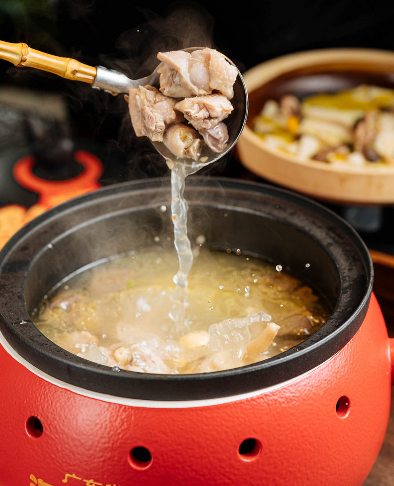 以雞為主要烹飪食材,洞庭土雞館的湖南師傅創(chuàng)造出了不一樣的菜肴。每桌食客坐下,都少不得一碗暖乎乎的洞庭土雞湯來“開場(chǎng)”。它的登場(chǎng)也相當(dāng)有氣勢(shì),長沙紅磚窯特別定制的大湯鍋,內(nèi)膽是紫砂構(gòu)造,這樣的設(shè)計(jì)既是出于美觀,又是出于更長時(shí)間更有效保溫的效果。俗話說得好,工欲善其事必先利其器。土雞方面,師傅特別精選了湖南竹山雞,肉質(zhì)的彈性略勝一籌,據(jù)介紹,竹山雞的養(yǎng)殖戶開放了大片山頭讓雞跑,放養(yǎng)時(shí)間足夠長,達(dá)到一年多,在如今快節(jié)奏的社會(huì)里已實(shí)屬難得。老雞加山泉水文火熬3個(gè)小時(shí),并沒有其他的味道干擾,簡(jiǎn)簡(jiǎn)單單就是本味。