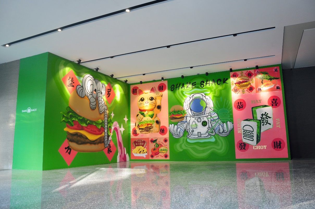 圍擋的室內(nèi)部分采用創(chuàng)新的互動形式,由藝術(shù)家現(xiàn)場親自手繪完成的8幅單元涂鴉畫板組合而成。藝術(shù)家用摩登時尚的波譜藝術(shù),向當(dāng)?shù)刭e客們奉送出中國傳統(tǒng)的祝福及Shake Shack的活力熱情。