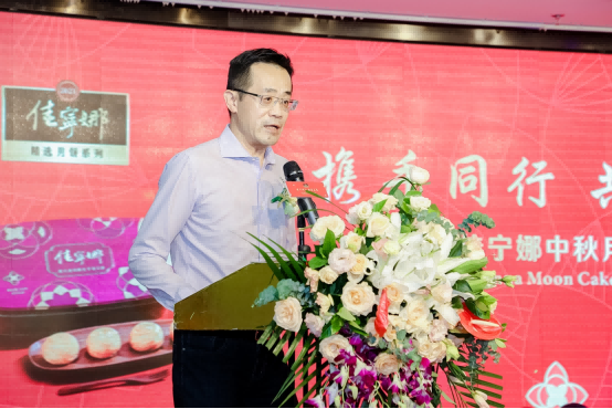 佳寧娜食品深圳首席品牌官及運營總監(jiān)潘小兵在活動現(xiàn)場講解2021年熱銷月餅