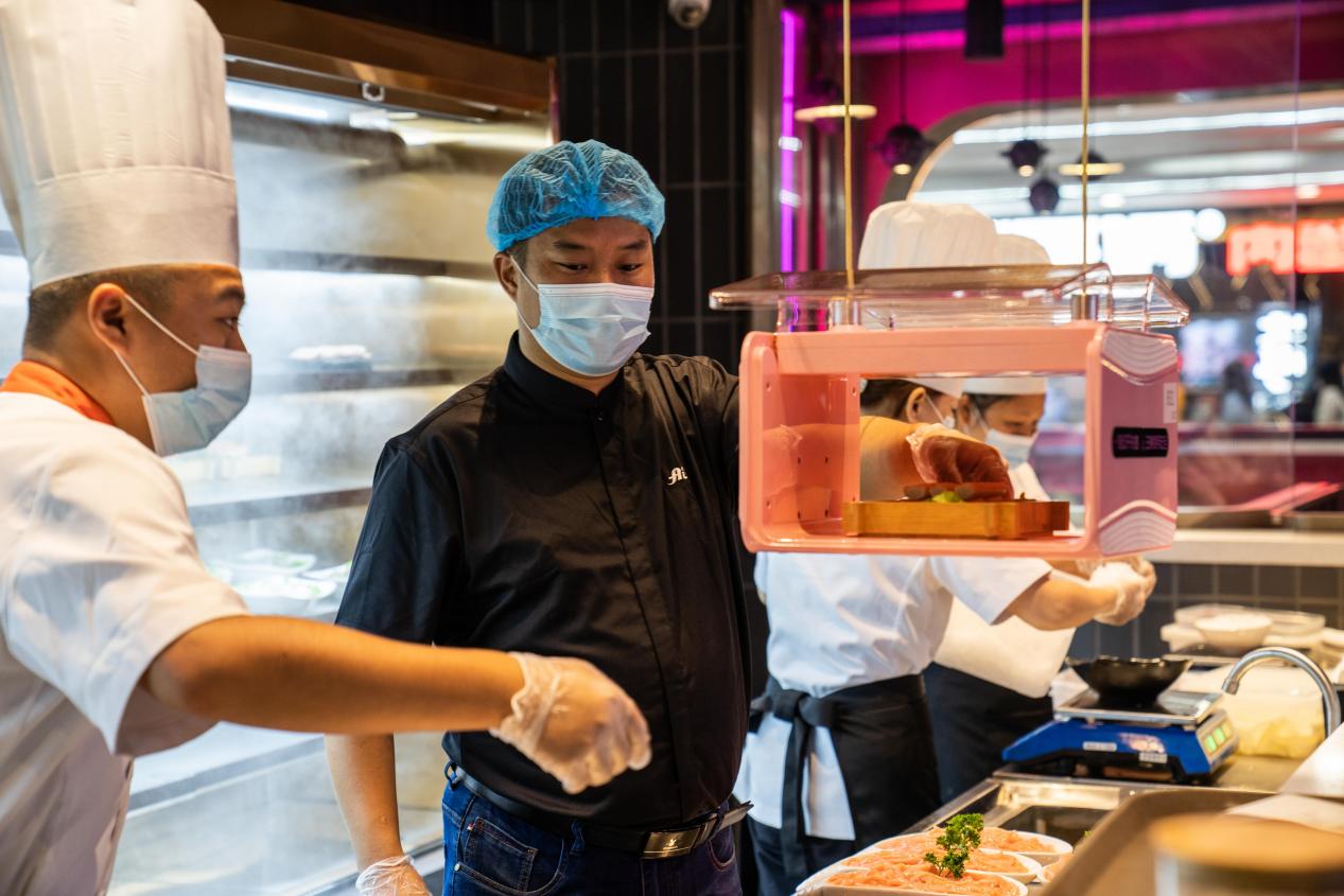 值得一提的是,除了地道的火鍋美食,這家餐廳的特別之處,在于高科技智能機(jī)器人的廣泛應(yīng)用。在餐廳過道里,一款名為“蠶豆”的配送機(jī)器人來回奔忙,把各式菜品有條不紊地送達(dá)顧客桌前。半空中,高效穿梭的云軌小車將菜品傳送到餐桌,“從天而降”呈現(xiàn)在顧客面前,科技體驗感十足。這款“天降”智能云軌傳輸系統(tǒng),由智能配餐、智能云軌兩大模塊構(gòu)成。顧客通過手機(jī)下單后,智能配餐系統(tǒng)接到指令,能自動將相應(yīng)菜品餐食分配給云軌小車,高效、快速地配送到對應(yīng)餐桌,整個送餐過程實現(xiàn)“零接觸”,在高效率的同時,確保了安全衛(wèi)生。