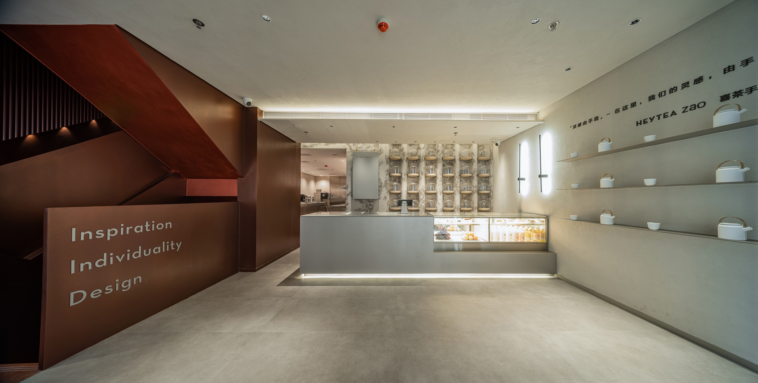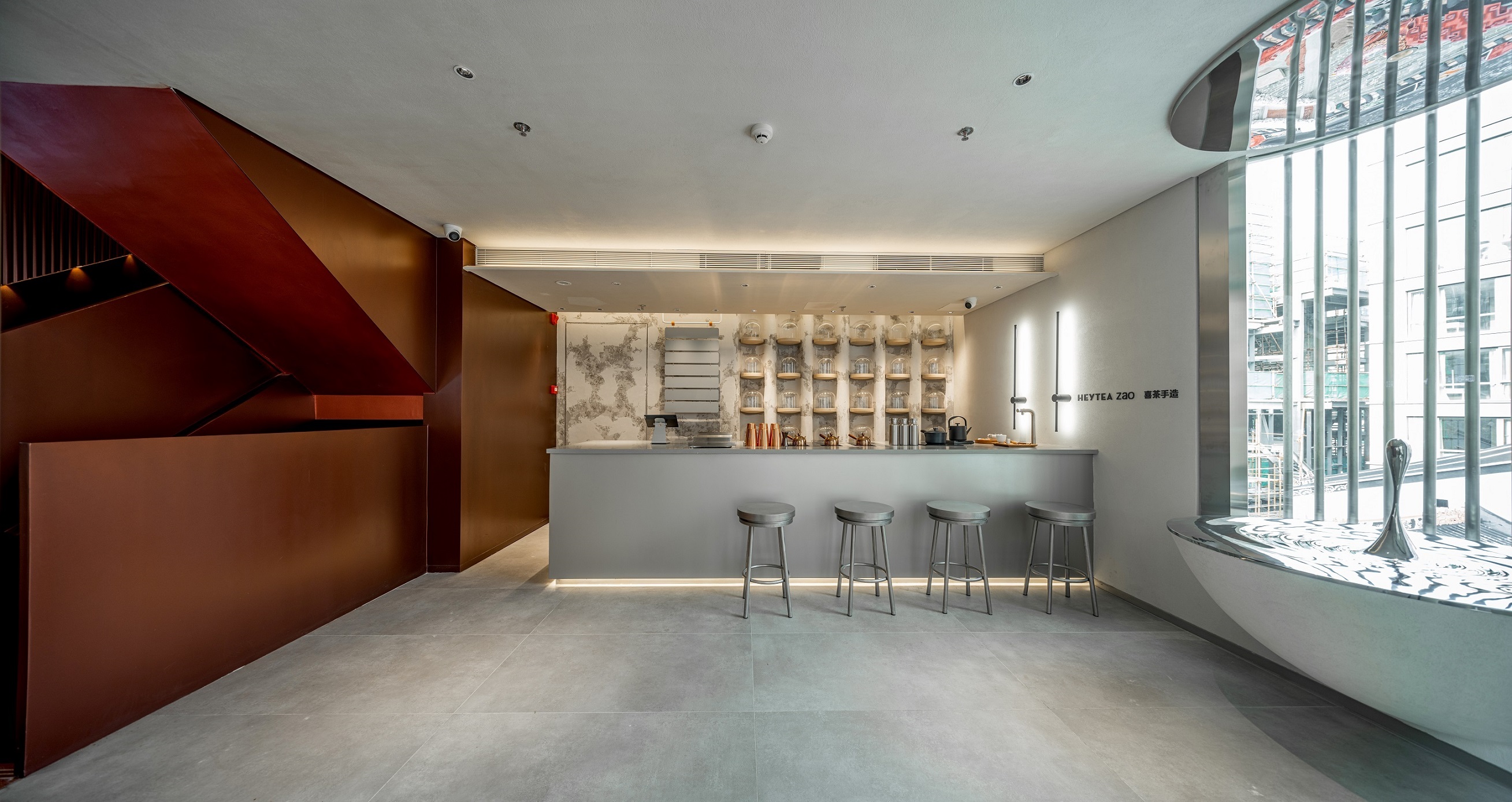 在內部設計上,喜茶同樣以創(chuàng)新的功能空間設置和突破性設計,呼應每一樓層的手造主題,升級了消費者的空間體驗。喜茶將一樓正門墻體改造為玻璃移門,塑造出通透的門店空間;變封閉窗戶為開放的門,讓顧客看得見手造產品的全過程。此外,在用色與材質搭配上,門店內部整體采用嶺南復古紅與現(xiàn)代極簡白搭配,做舊復古肌理漆與現(xiàn)代化金屬材質呼應,不僅有效進行功能分區(qū),還體現(xiàn)歷史感與現(xiàn)代感的對比、融合。