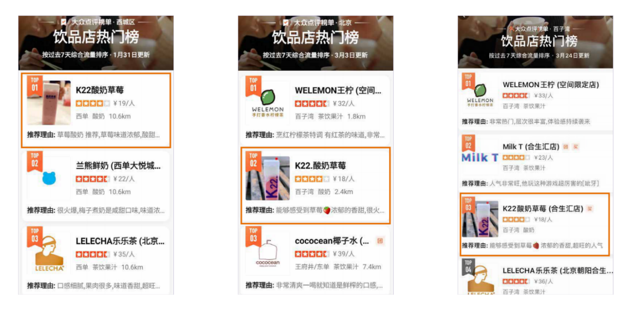 自帶流量的K22.酸奶草莓很快把店開進了北京一線商圈——西單大悅城,并在當(dāng)時火速登頂大眾點評西城區(qū)熱門榜 TOP1,成為當(dāng)之無愧的北京排隊王。