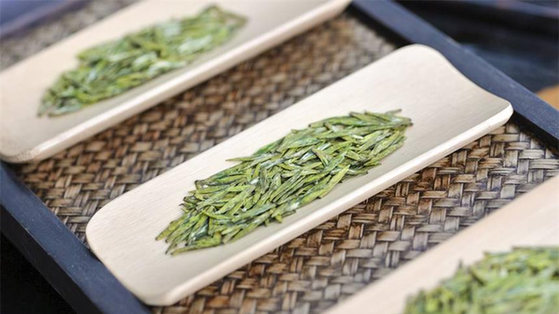 君山銀針:外形芽頭肥壯挺直、勻齊,滿披茸毛,色澤金黃光亮,稱“金鑲玉”;內(nèi)質(zhì)香氣清鮮,湯色淺黃,滋味甜爽。