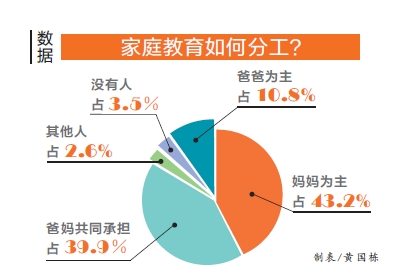 此次調(diào)查中,用14個指標考察家庭教育分工情況,包括:輔導孩子學習、培養(yǎng)孩子特長、接送孩子上下學、開家長會、培養(yǎng)孩子日常行為習慣、糾正孩子的不良行為、教孩子明辨是非、照顧孩子的飲食起居、和孩子一起游戲及和孩子聊天。統(tǒng)計數(shù)據(jù)顯示,家庭教育分工中,“媽媽為主”的家庭占43.2%,“爸爸為主”占10.8%,“爸媽共同承擔”占39.9%,“其他人做”占2.6%,“沒有人做”占3.5%。