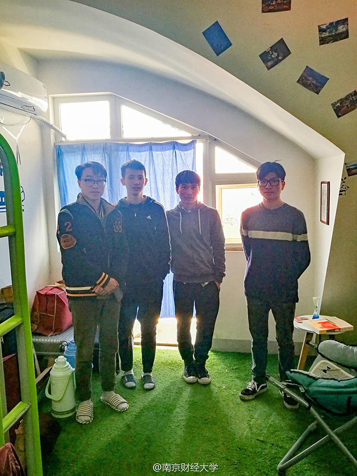 綿綿的草坪、充滿設(shè)計感的書架、掛著素描畫的墻……難以想象這是四個19歲男生的寢室。南京財經(jīng)大學西苑9幢男生宿舍頂樓602寢室,住著4位“世外高人”—— 涂貴平、柯毅、劉以康和廉鎮(zhèn)宇,他們用事實告訴大家,男生宿舍文藝起來,可絲毫不輸女生。