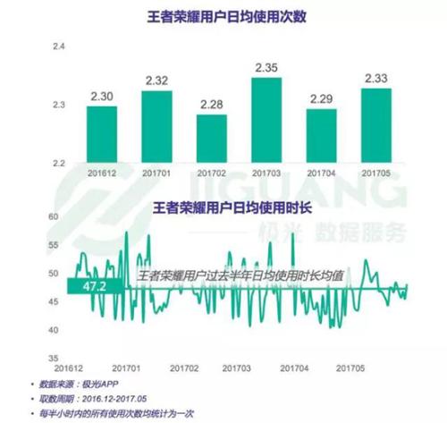 根據(jù)極光大數(shù)據(jù)的統(tǒng)計(jì),《王者榮耀》用戶白天游戲高峰時(shí)段為12:00-13:00,占比為6.97%;晚間游戲高峰為21:00-23:00,共占比13.63%在過去的半年里《王者榮耀》日均使用次數(shù)在2.3次左右,日均使用時(shí)長(zhǎng)基本在40~55分鐘這一區(qū)間。從此處來看,其用戶使用情況并沒有達(dá)到一個(gè)與常規(guī)游戲差異巨大的程度。