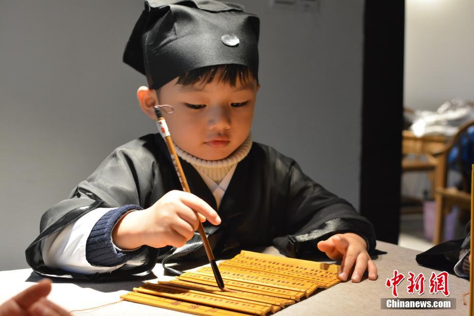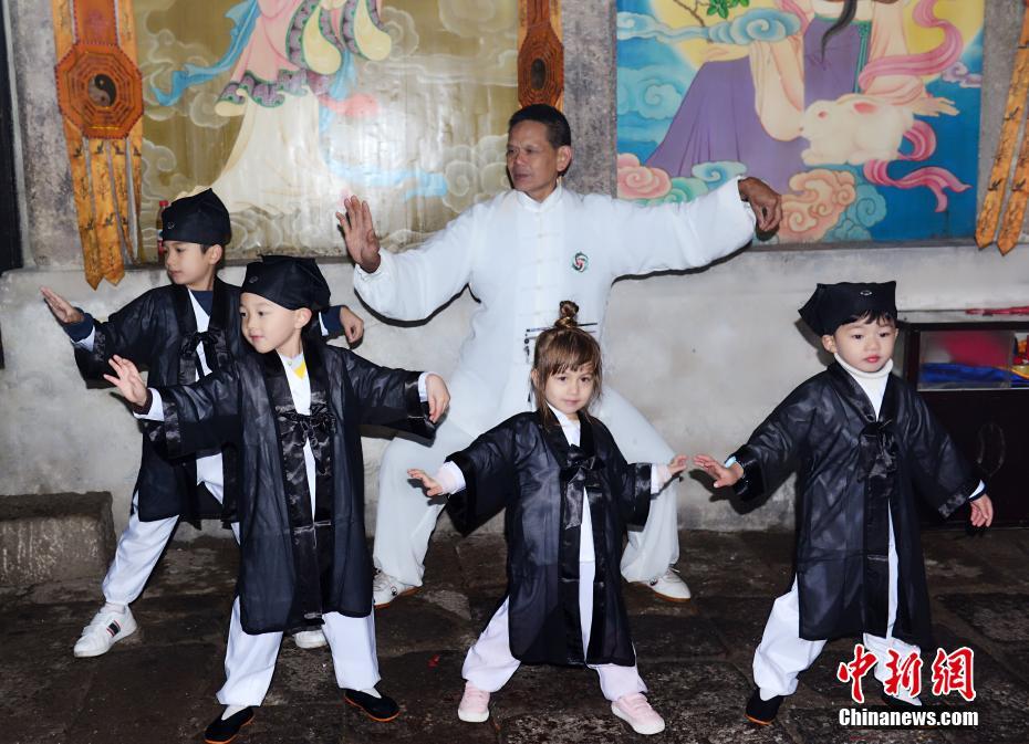 10月16日,在“道教名山”、世界自然遺產(chǎn)地江西上饒三清山,5名來自中外的萌娃身穿統(tǒng)一道服,手持竹簡,在三清宮跟著道教師傅朗讀《道德經(jīng)》、《弟子規(guī)》,學(xué)習(xí)太極拳、書法、古箏等中國傳統(tǒng)文化。這群萌娃中年齡最小的僅11個月,年齡最大也只有6歲。程希雪攝
