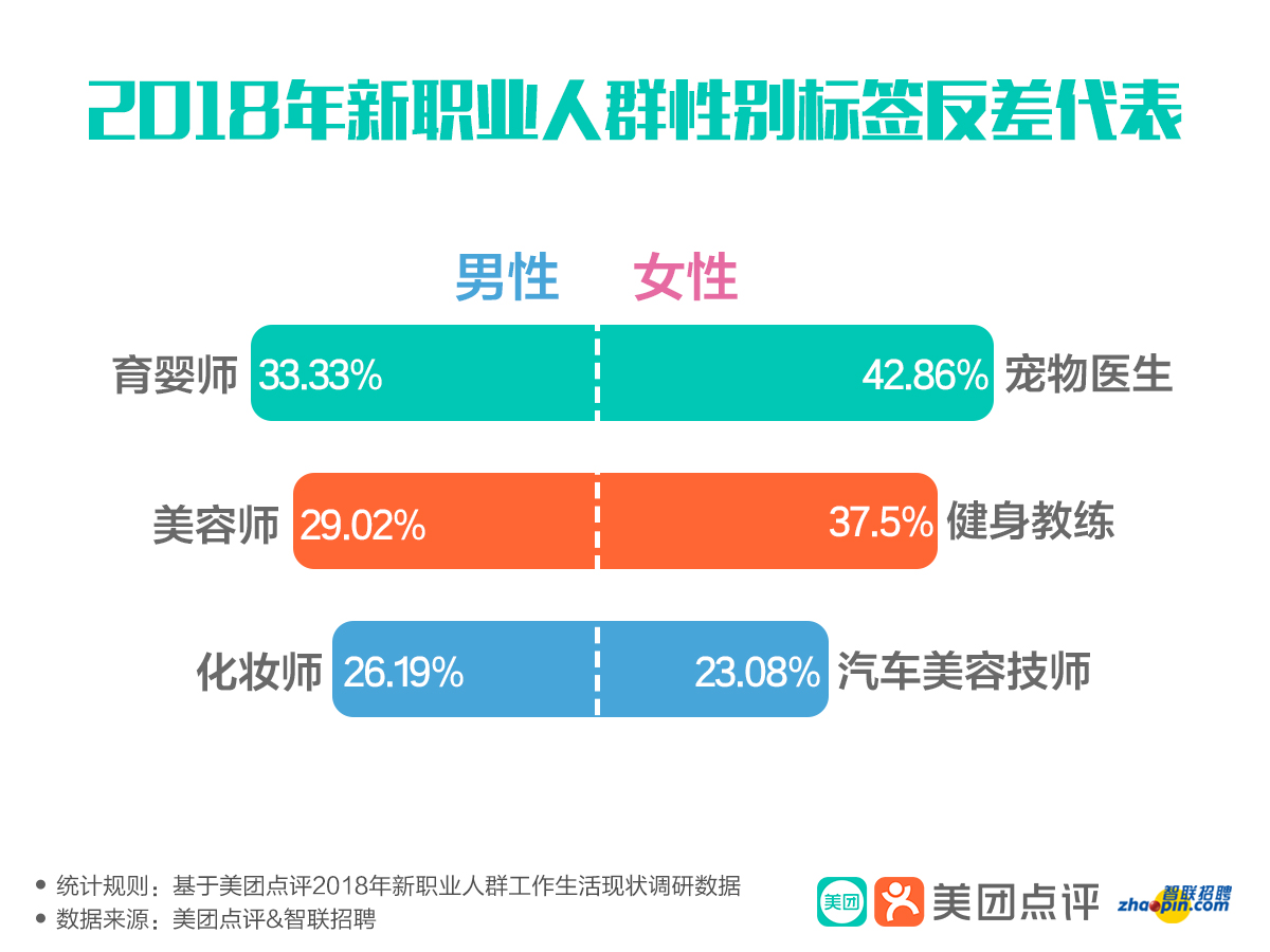 隨著社會觀念的發(fā)展進(jìn)步和就業(yè)群體的年輕化,越來越多的年輕人以“興趣為導(dǎo)向”,堅持“自我”、“率性”、“不畏人言”,其就業(yè)觀與傳統(tǒng)大眾視角逐漸形成反差。報告發(fā)現(xiàn),寵物醫(yī)生、全屋定制設(shè)計師、汽車美容技師等新職業(yè),盡管勞動強(qiáng)度大、工作時間長、體力消耗嚴(yán)重,但已經(jīng)有大量的女性涉足。數(shù)據(jù)顯示,在男性標(biāo)簽更強(qiáng)的汽車美容技師中,女性占比達(dá)到了23.08%;在勞動強(qiáng)度較大的寵物醫(yī)生中,女性占比高達(dá)42.86%。