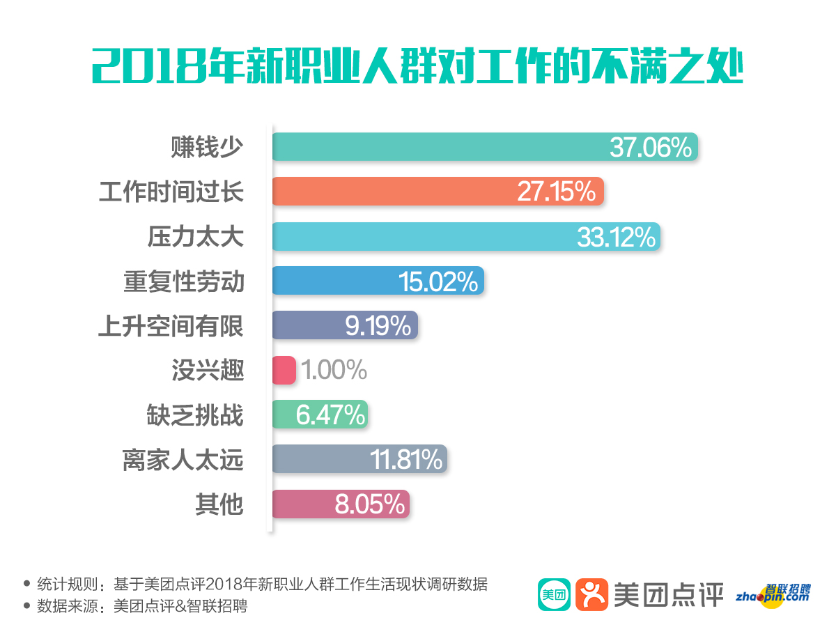 盡管新職業(yè)人群因為“喜歡這個行業(yè)和職業(yè)”而加入,但對更高薪資待遇的追求,與白領(lǐng)是一致的。談及對工作的不滿之處,盡管他們對工作有一些抱怨,在此項調(diào)研上有多重表達(dá),但最大的不滿還是直指薪酬水平。報告發(fā)現(xiàn),被新職業(yè)人群認(rèn)為對工作不滿的前三大原因是:賺錢少、壓力太大、工作時間太長。