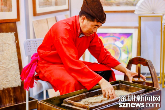 塔城東巴造紙第七代傳承人李學高在現(xiàn)場持續(xù)“敲、打、洗、晾”的一系列工序,演繹東巴造紙的精湛工藝。東巴紙被稱為“活化石”,是采用納西地區(qū)稀有植物的樹皮制作而成,這些“千年不腐”的東巴紙不僅可用于書寫,添加花瓣、樹枝后的東巴紙燈用作裝飾也非常好看。