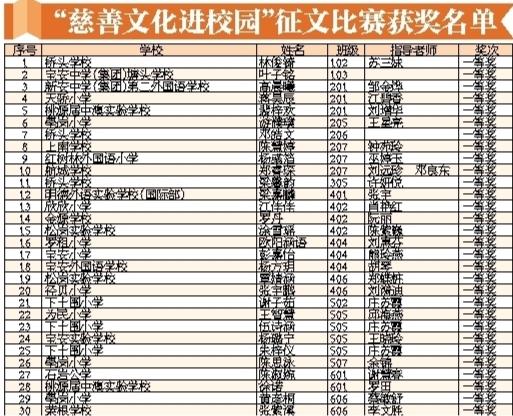寶安日報2020年1月2日訊 2019年12月31日下午,寶安區(qū)慈善文化進校園征文比賽表彰暨2019年度工作總結(jié)會在寶安實驗學(xué)校會議室舉行。會上對征文比賽獲獎?wù)吆蛢?yōu)秀組織單位進行表彰。學(xué)生代表分享慈善故事,學(xué)校代表則分享慈善文化進校園經(jīng)驗。此次慈善文化進校園征文活動是由區(qū)教育局、區(qū)慈善會、寶安日報社、寶安廣電中心共同主辦,征文主題是“慈善在我身邊”,活動在全區(qū)中小學(xué)生中進行征集。經(jīng)過兩個月的征集和評比,最終評出3個組別的一、二、三等獎和優(yōu)秀組織單位。