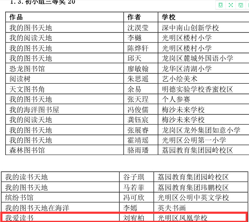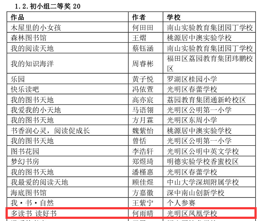 在深圳市4·23世界讀書日“探索閱讀新領(lǐng)域”創(chuàng)作比賽中學(xué)校榮獲優(yōu)秀組織獎,何雨晴、劉宥伯同學(xué)分別獲初小組二等獎、三等獎;阮澤宇、張雪怡同學(xué)分別榮獲初中組二等獎、三等獎。郭瑞芳老師榮獲優(yōu)秀指導(dǎo)老師獎,曾嵽稜、賴美君、李海亮榮獲優(yōu)秀組織老師獎。