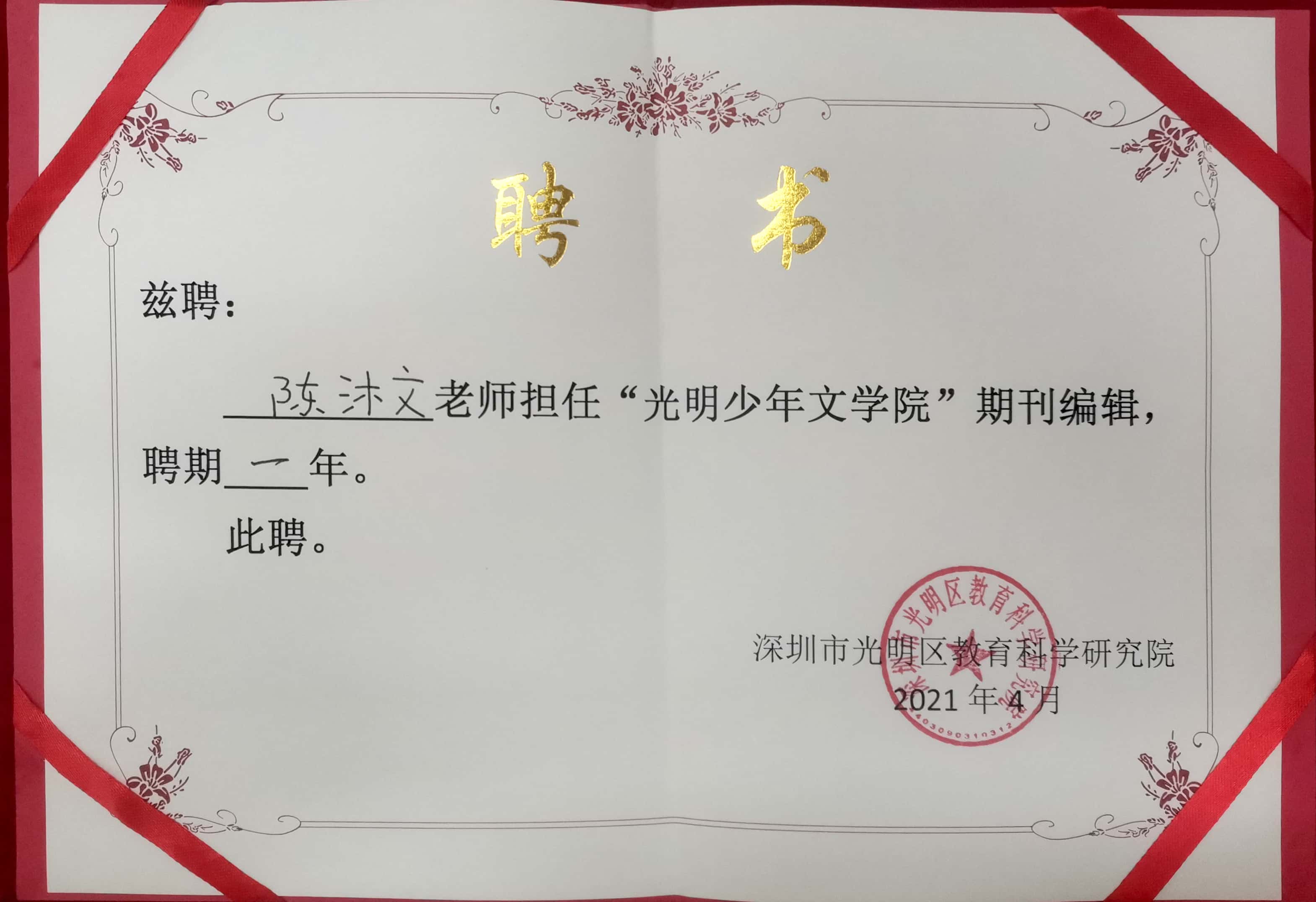 在光明區(qū)少年文學(xué)院評選中,學(xué)校獲批成立“光明區(qū)少年文學(xué)院分院”,陳沐文老師擔(dān)任文學(xué)院期刊編輯,方汶琪、劉梓萌、吳青華三位同學(xué)被授予“預(yù)備小院士”稱號。