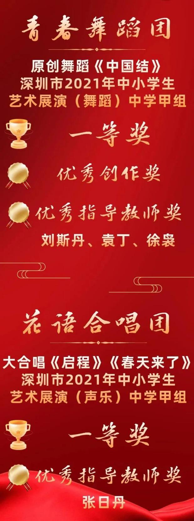 二實青春舞蹈團以原創(chuàng)作品《中國結(jié)》在全市各區(qū)以及市直屬學校選拔出來的37個節(jié)目中脫穎而出,獲得全場最高分!接下來,青春舞蹈團將代表深圳市參加省賽,有望沖擊全國決賽!此外,二實花語合唱團也憑借大合唱《啟程》《春天來了》榮獲深圳市2021年中小學藝術展演(聲樂)中學甲組一等獎。劉斯丹、袁丁、徐裊、張日丹等老師榮獲優(yōu)秀指導老師獎。