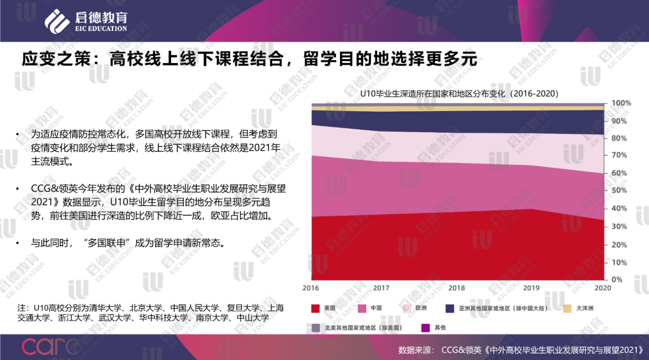 全球化智庫與領(lǐng)英發(fā)布的《中外高校畢業(yè)生職業(yè)發(fā)展研究與展望2021》數(shù)據(jù)顯示,中國 U10 (清華大學(xué)、北京大學(xué)、中國人民大學(xué)、復(fù)旦大學(xué)、上海交通大學(xué)、浙江大學(xué)、武漢大學(xué)、華中科技大學(xué)、南京大學(xué)、中山大學(xué) )畢業(yè)生繼續(xù)深造的國家與地區(qū)選擇更趨多樣化,前往美國留學(xué)的比例下降近一成,留學(xué)亞洲與歐洲的占比增加。