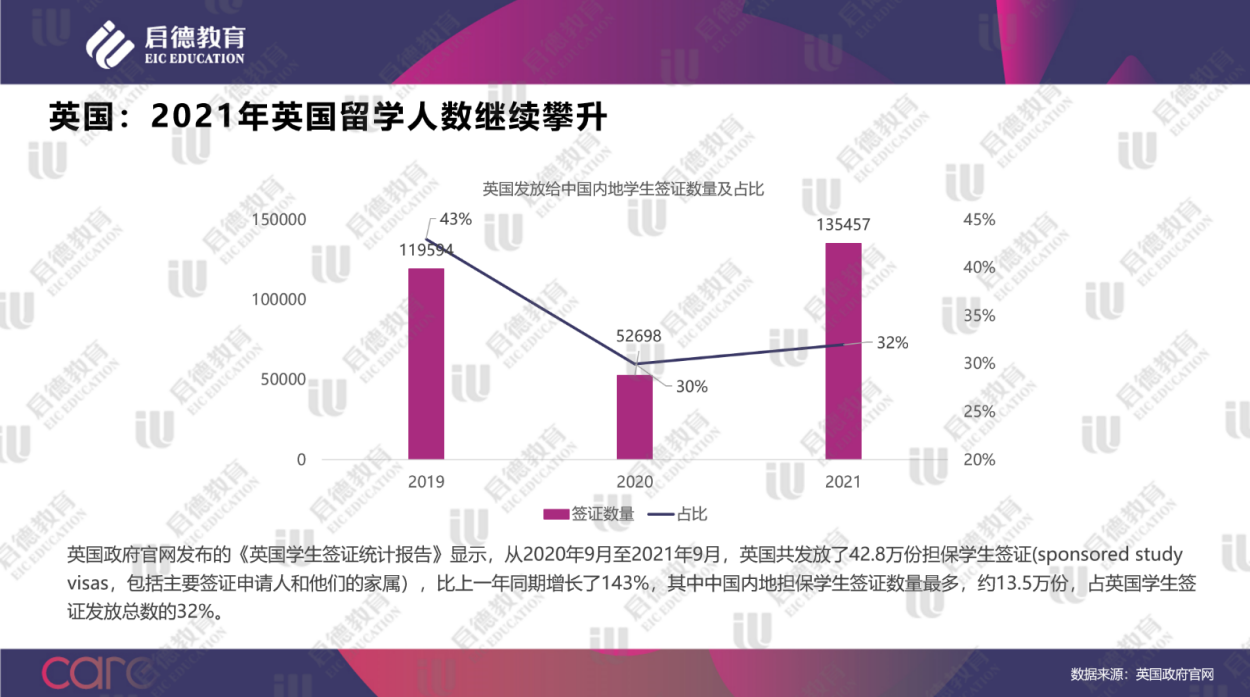 英國政府官網(wǎng)發(fā)布的《英國學(xué)生簽證統(tǒng)計(jì)報(bào)告》顯示,從2020年9月至2021年9月,英國共發(fā)放了42.8萬份擔(dān)保學(xué)生簽證(sponsored study visas,包括主要簽證申請人和他們的家屬),比上一年同期增長了143%,其中中國內(nèi)地?fù)?dān)保學(xué)生簽證數(shù)量最多,約13.5萬份,占英國學(xué)生簽證發(fā)放總數(shù)的32%。