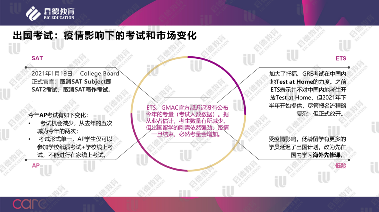 與此同時(shí),國產(chǎn)疫苗被海外多國認(rèn)可。此外,各種跡象表明,作為最主要的留學(xué)語言,2021年英語考試認(rèn)證已放寬,考點(diǎn)也在增多。除了日本37所知名院校開展全英文授課外,韓國也可用英語成績遞交申請,法國提供1700個(gè)左右的英文授課課程,荷蘭碩士英語授課覆蓋率為95%,英語普及率在全世界非英語母語國家中最高。2021年1月19日,College Board正式宣布取消SAT Subject即SAT2考試,取消SAT寫作考試。2021年下半年 ETS對中國內(nèi)地考生開放Test at Home。同年,BC也在加快在中國內(nèi)地的雅思機(jī)考考點(diǎn)建設(shè)速度,計(jì)劃2022年將雅思機(jī)考考點(diǎn)覆蓋內(nèi)地四十多個(gè)城市。