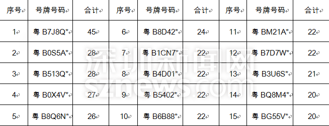 交通違法記錄大于20次的15輛車牌號(hào)碼